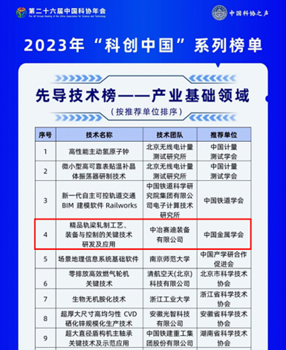 7月2日,中國科學(xué)技術(shù)協(xié)會正式發(fā)布2023年“科創(chuàng)中國”系列榜單,中冶賽迪“精品軌梁軋制工藝裝備與控制關(guān)鍵技術(shù)”上榜產(chǎn)業(yè)基礎(chǔ)領(lǐng)域先導(dǎo)技術(shù)榜單。